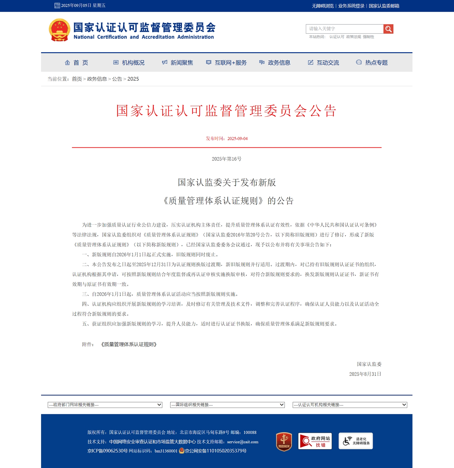 > 行业动态 > 认监委关于发布新版 《质量管理体系认证规则》的公告