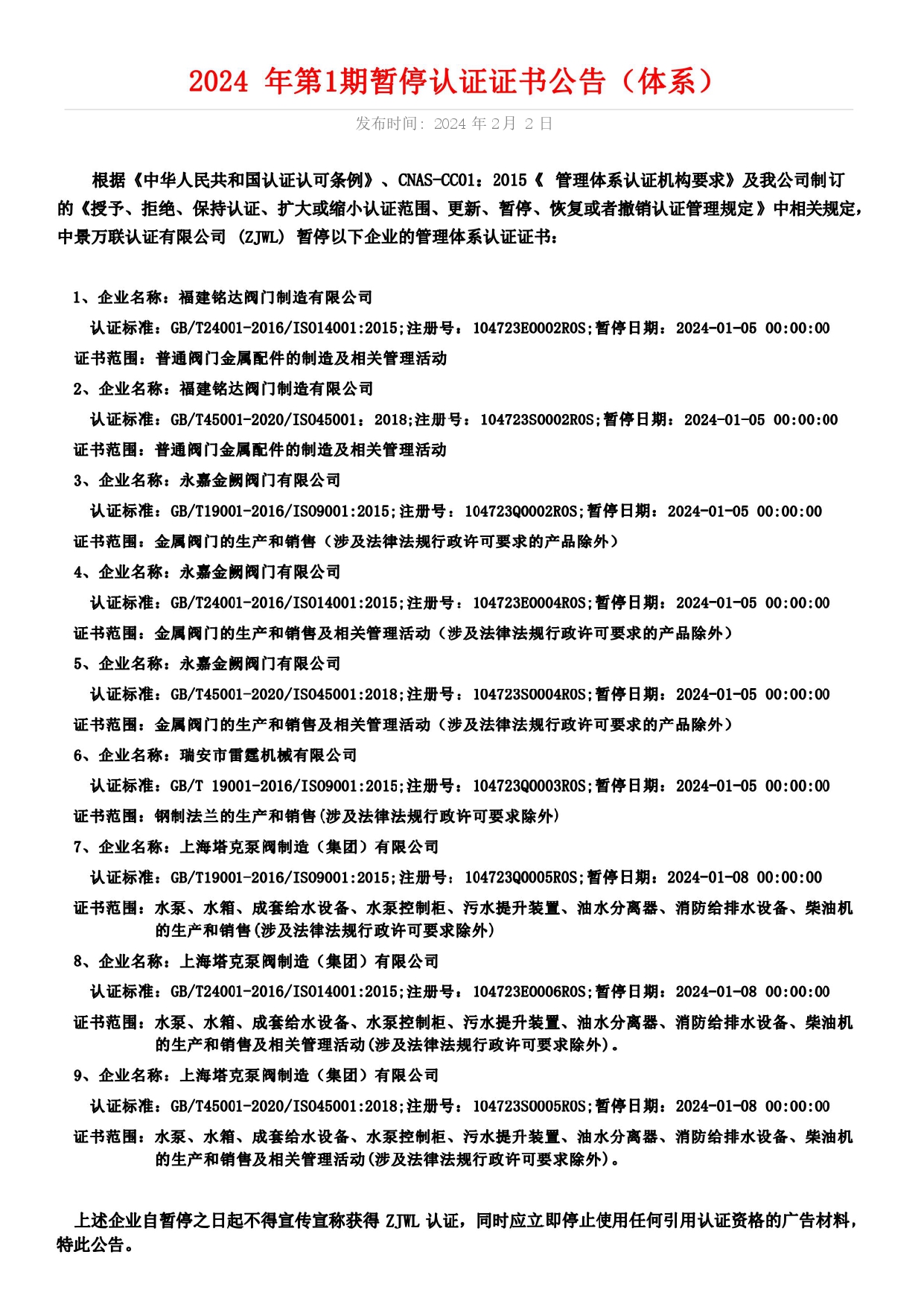 > 通知公告 > 2024 年第1期暂停认证证书公告
