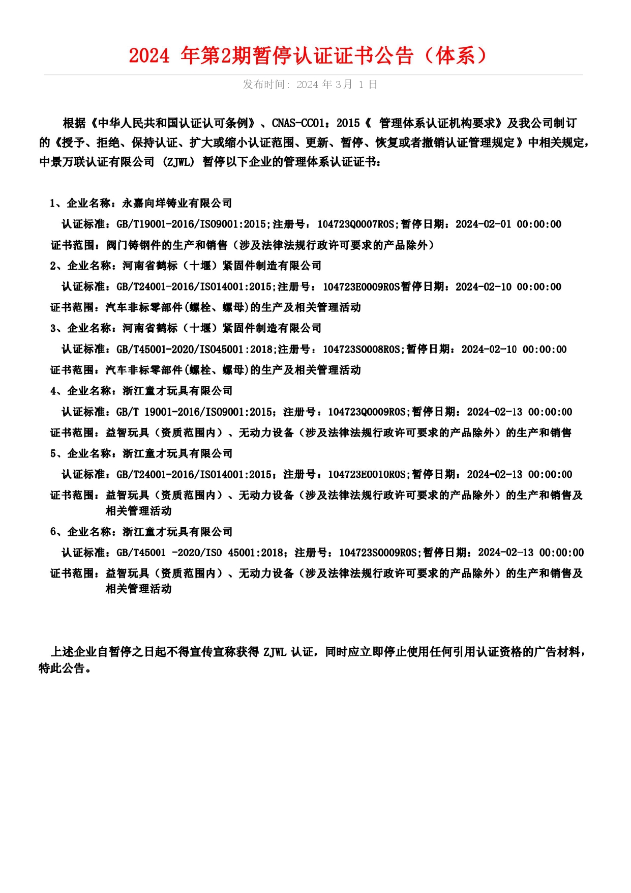 > 通知公告 > 2024 年第2期暂停认证证书公告
