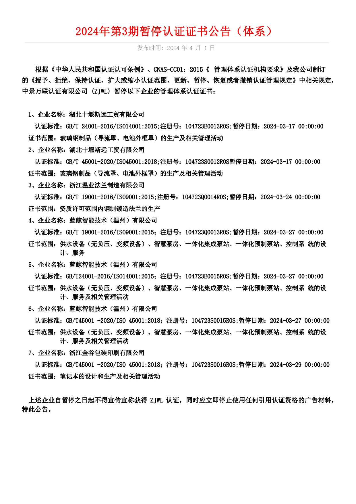> 通知公告 > 2024 年第3期暂停认证证书公告