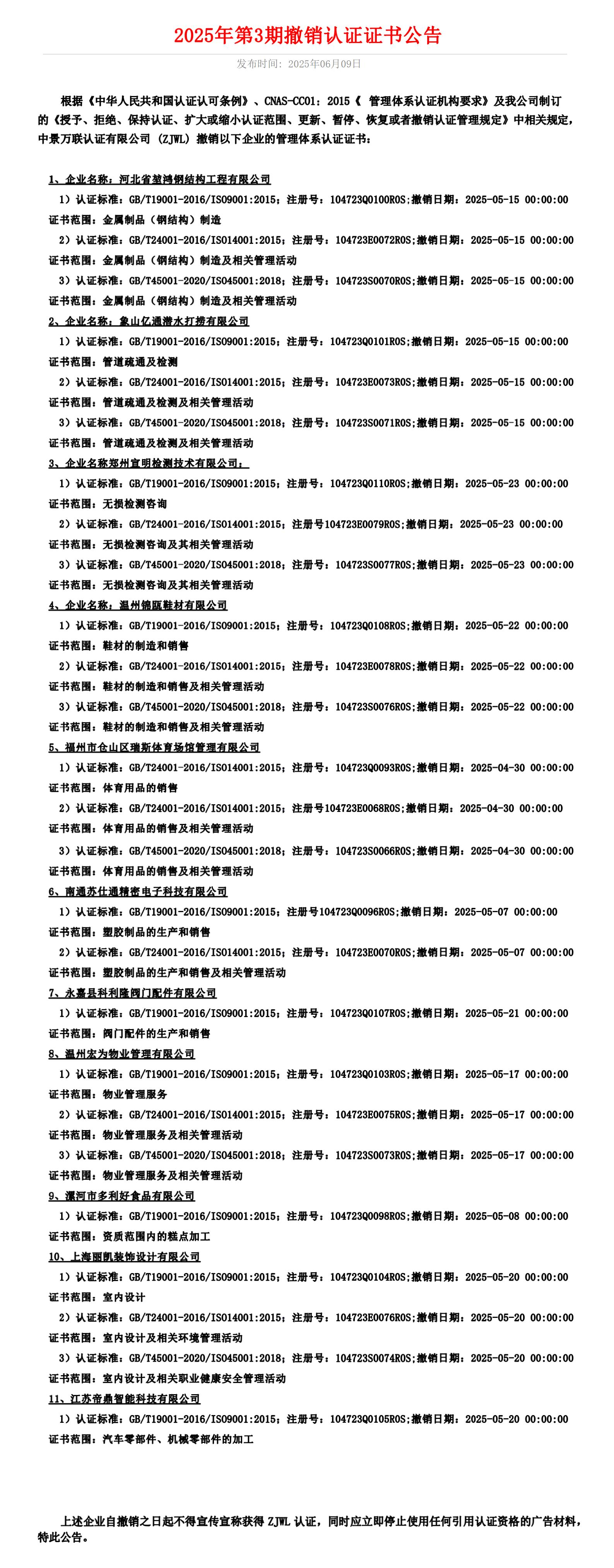 > 通知公告 > 2025年第3期撤销认证证书公告