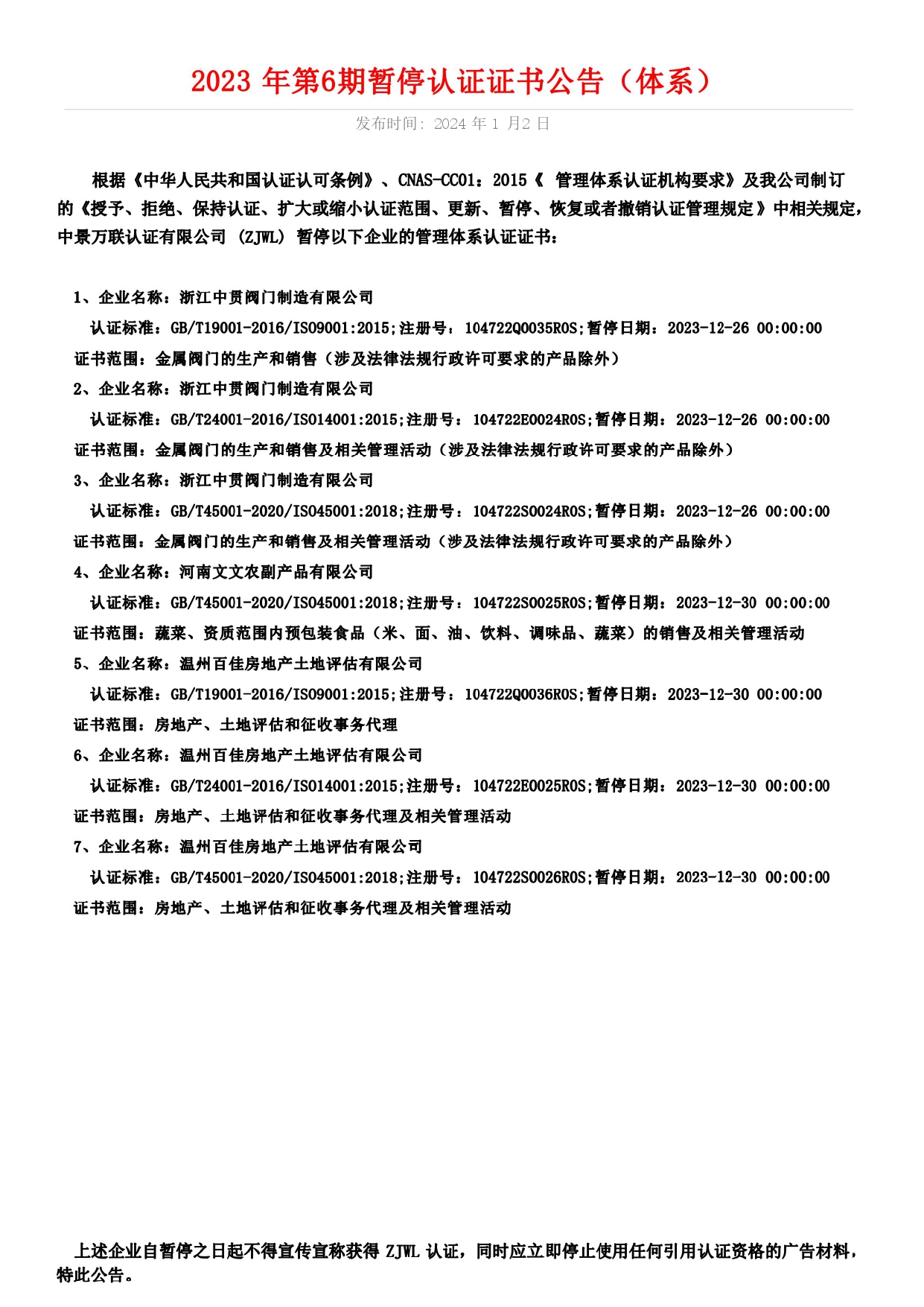 > 通知公告 > 2023 年第6期暂停认证证书公告