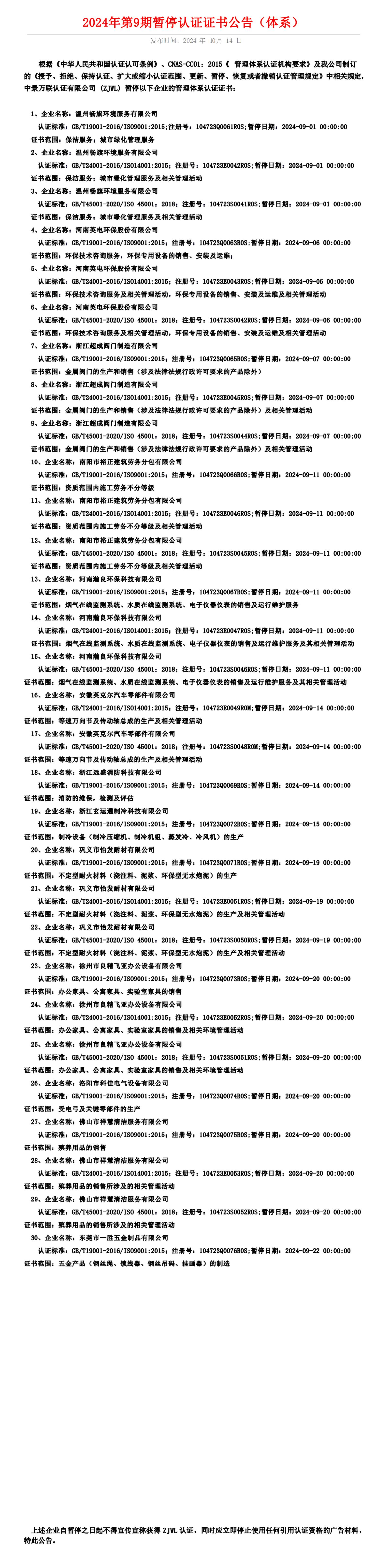 > 通知公告 > 2024年第9期暂停认证证书公告